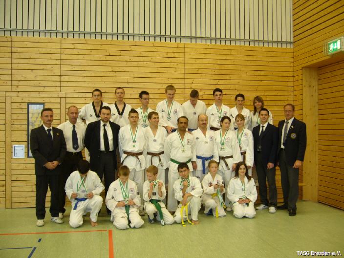 Herzlichen Glückwunsch an alleTeilnehmer der Landesmeisterschaft am 13. Oktober 2007 in Freiberg. Die Dresdner Sportler, die für den Taekwondo Allkampf Club Dresden e.V. an den Start gingen, zeigten bei dieser offenen Meisterschaft eine beeindruckende Leistung. So konnten die Taekwondo-Sportler aus Dresden, dank der herausragenden Einzelleistungen jedes Einzelnen, sowohl die Vereinswertung der Landesmeisterschaft als auch die des Sachsenpokals klar für sich entscheiden. Ganz besonders sei an dieser Stelle, stellvertretend für alle Anderen, die erst 10-jährige Jasmin Kerbach genannt. Nicht nur, dass sie seit mehreren Jahren nun schon fast ein Garant für die forderen Plätze ist - dieses Mal kämpfte sie sich trotz unangenehmer gesundheitlicher Probleme durch ein sehr starkes 12-köpfiges Starterfeld. Lohn für die Strapazen war dann ein hervorragender 3. Platz für Jasmin. Insgesamt können wir stolz auf das Erreichte sein, werden uns aber natürlich nicht auf den Lorbeeren ausruhen - denn im nächsten Jahr haben wir dann einen Titel zu verteidigen.