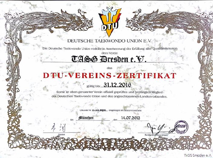 Als ersten Verein aus Sachsen und damit auch in Dresden überhaupt, wurde im Jahr 2013 unserem Verein das Qualitätszertifikat des Bundesfachverbandes verliehen. In diesem Jahr erhält unser Verein dieses Zertifikat nun schon zum dritten Mal in Folge - und dies bundesweit als erster Verein überhaupt. Damit bestätigt der Bundesfachverband, die Deutsche Taekwondo Union, erneut die kontinuierliche Erfüllung aller gestellten Qualitätskriterien. Überprüft werden hier u.a. die Struktur des Vereins an sich und ob der Verein sich konsequent an die Richtlinien und Regularien des Fachverbandes hält. Ein wesentlicher Bestandteil der Prüfung ist aber auch, die Überprüfung der kontinuierlichen Aus- und Weiterbildung der Sportler und vor allem auch der Trainer sowie die kontinuierlich Förderung von Nachwuchstalenten.