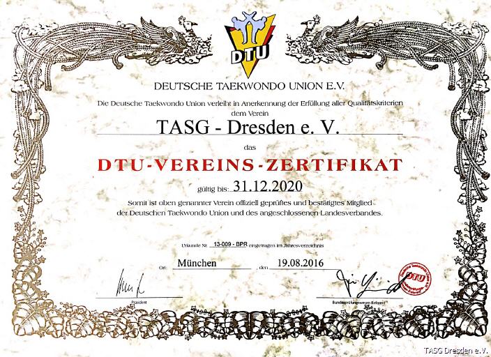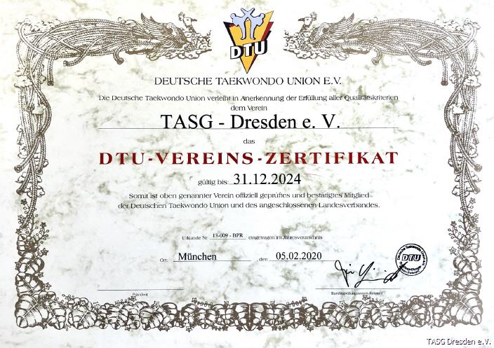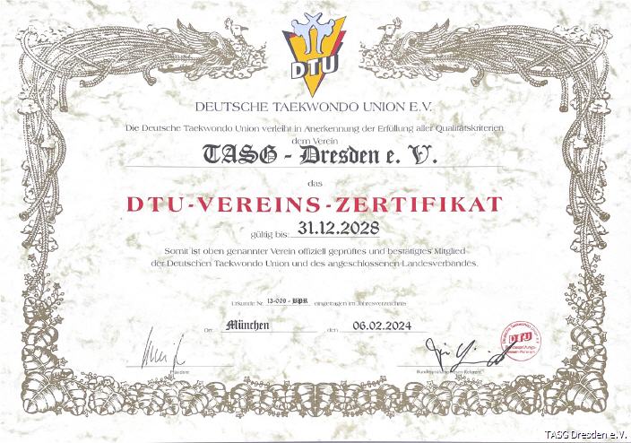 Als ersten Verein aus Sachsen und damit auch in Dresden überhaupt, wird unserem Verein das Qualitätszertifikat des Bundesfachverbandes verliehen. Damit bestätigt der Bundesfachverband, die Deutsche Taekwondo Union, die Erfüllung aller gestellten Qualitätskriterien. Überprüft werden hier u.a. die Struktur des Vereins an sich und ob der Verein sich konsequent an die Richtlinien und Regularien des Fachverbandes hält. Ein wesentlicher Bestandteil der Prüfung ist aber auch, die Überprüfung der kontinuierlichen Aus- und Weiterbildung der Sportler und vor allem auch der Trainer.